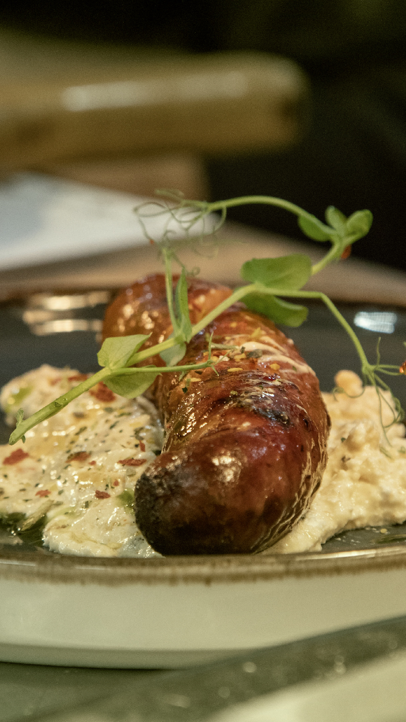 Greek stuffed sausage with sundried tomatoes and Graviera cheese on spicy cheese dip